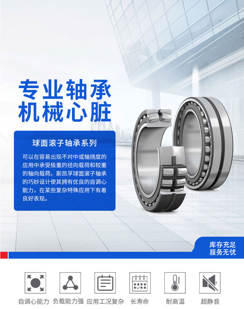 SKF球面滾子軸承的滾子的制造極為嚴(yán)格的公差尺寸和形式。每個輥子在集合中的其它輥的尺寸和形狀幾乎是相同的。優(yōu)化負(fù)荷分布輥軸承的使用壽命最大化。